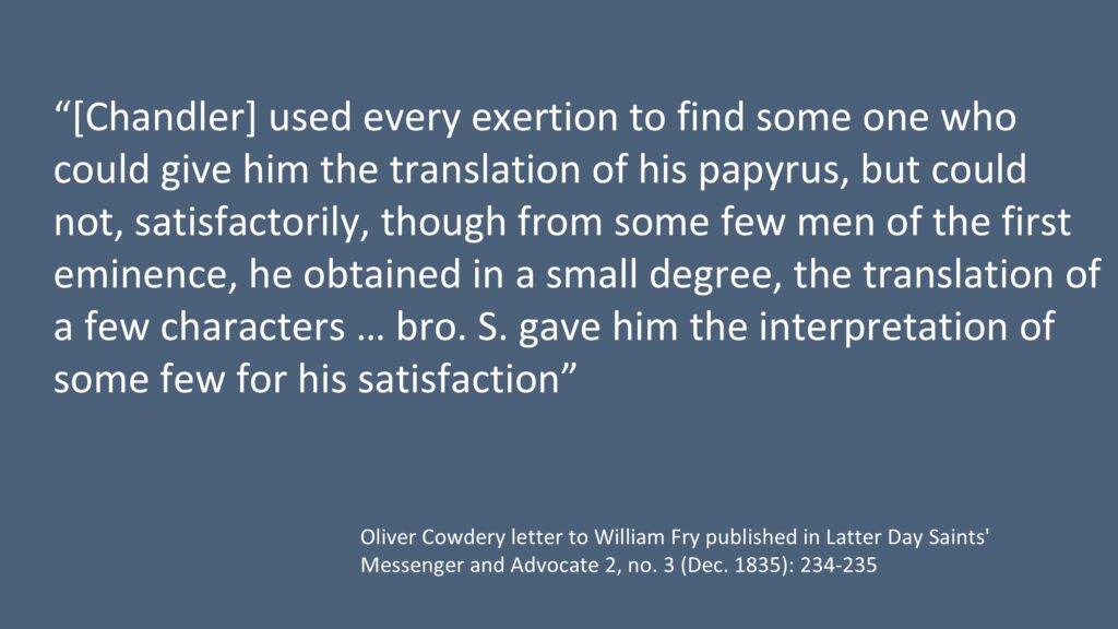 Consequently, Chandler’s statement in his certificate—that the eminent men’s most basic assessment matched Joseph’s interpretations of some few characters—strongly suggests that the prophet must have only provided undeveloped ideas about a few characters as well, not a translation of words or sentences. Chandler is only certifying a correlation of rudimentary ideas and nothing more.