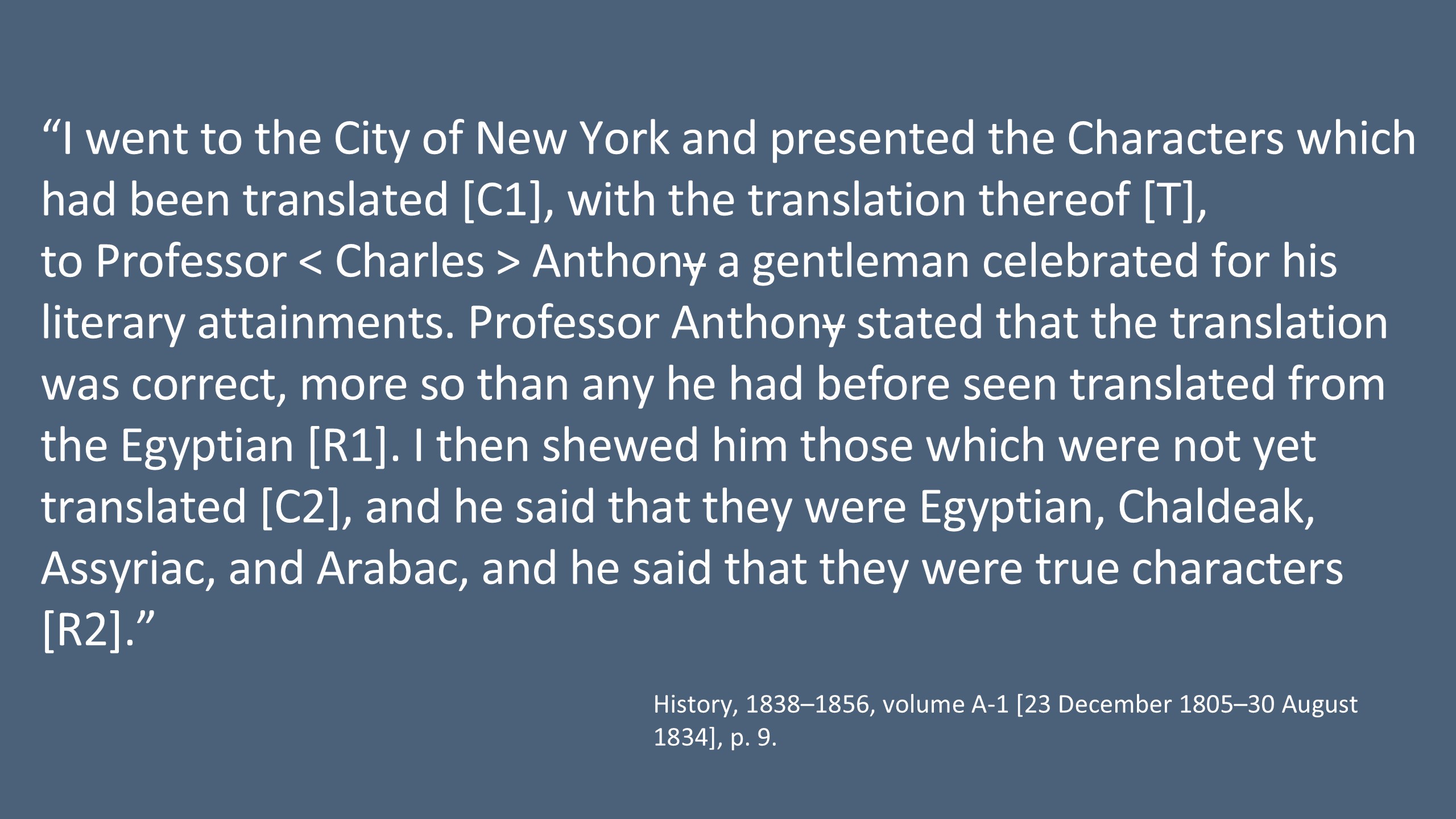 “I went to the City of New York and presented the Characters which had been translated [C1], with the translation thereof [T], to Professor <Charles> Anthony a gentleman celebrated for his literary attainments. Professor Anthony stated that the translation was correct, more so than any he had before seen translated from the Egyptian [R1]. I then shewed him those which were not yet translated [C2], and he said that they were Egyptian, Chaldeak, Assyriac, and Arabac, and he said that they were true characters [R2].”