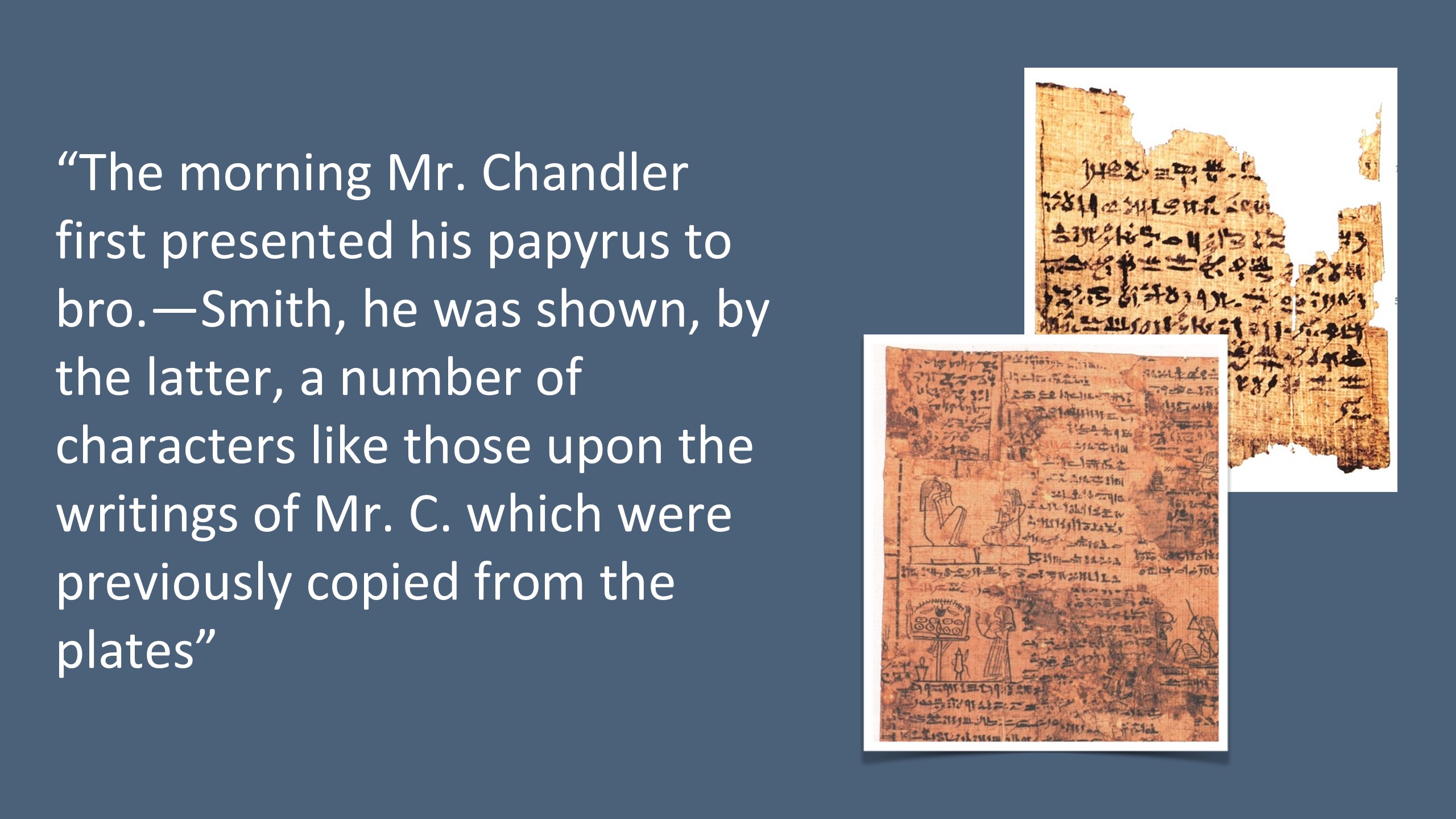 Cowdery goes on: “I’m a little in advance of my narration. The morning Mr. Chandler first presented his papyrus to Brother Smith, he was shown by the latter a number of characters like those written upon… sorry, those upon the writings of Mr. Chandler, which were previously copied from the plates containing the history of the Nephites or Book of Mormon.”