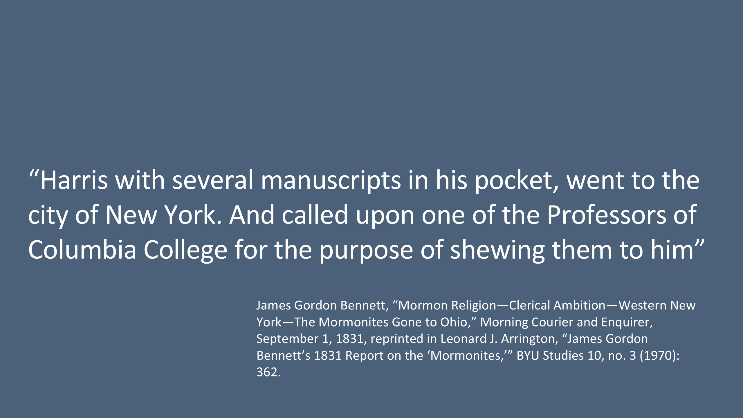 These details provide some additional possibilities to consider with respect to the kinds of characters Anthon was shown, as well as his ability to identify or translate them. A third-hand source from 1831 also suggested that Harris, with several manuscripts in his pocket, went to the city of New York and called upon one of the professors at Columbia College for the purpose of showing them to him.