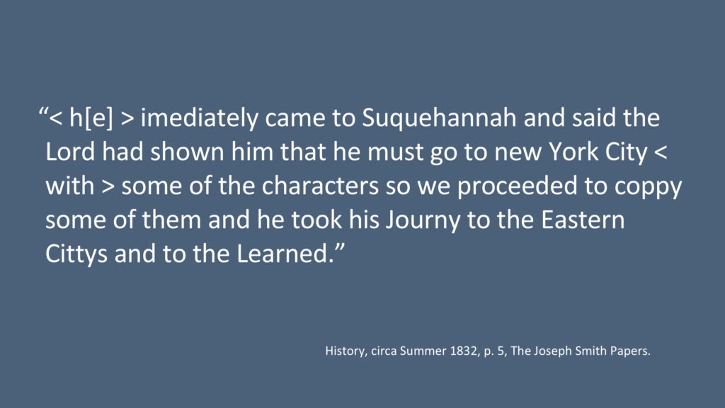 The 1838 history goes on to say that Mr. Martin Harris “came to our place, got the characters which I had drawn off of the plates, and started with them to the city of New York.” Again, the text does not actually specify a number of documents. It only says he “got the characters,” without any reference to their physical context.