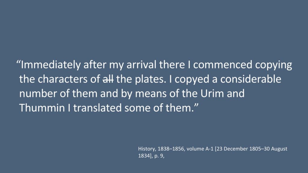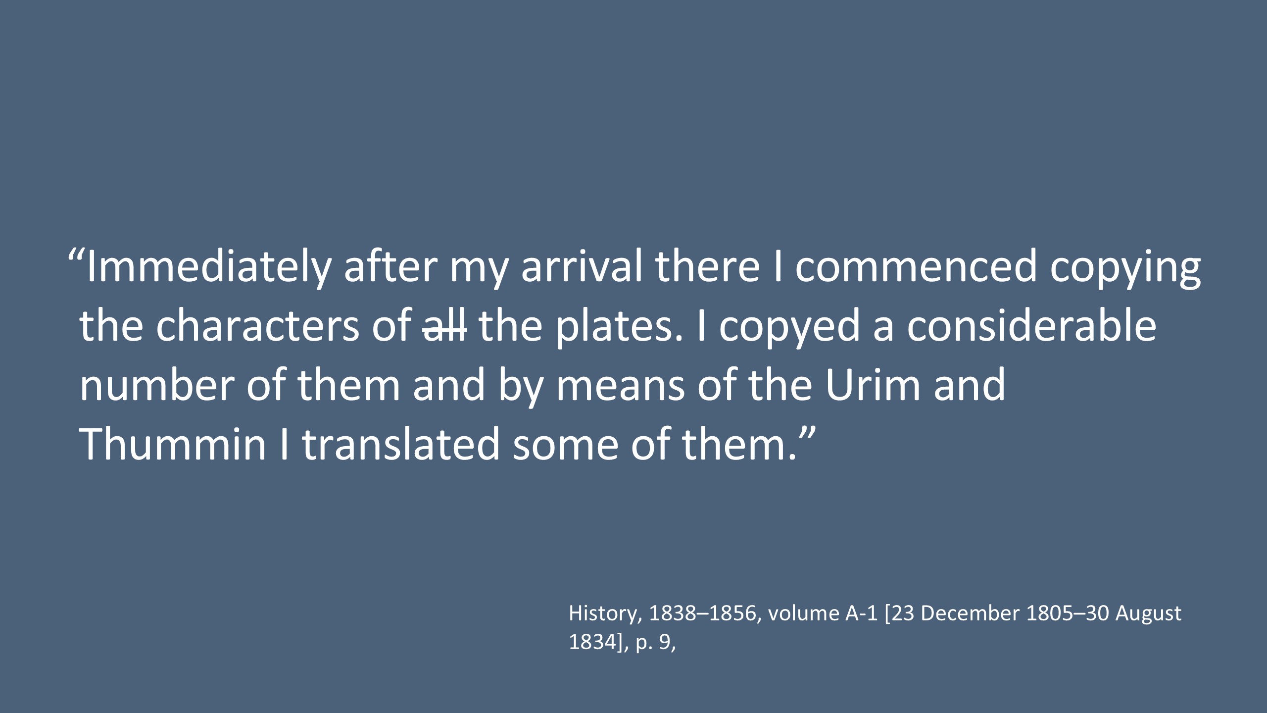 “Immediately after my [Joseph Smith’s] arrival there [in Pennsylvania] I commenced copying the characters of all the plates. I copyed [sic] a considerable number of them and by means of the Urim and Thummin I translated some of them.”