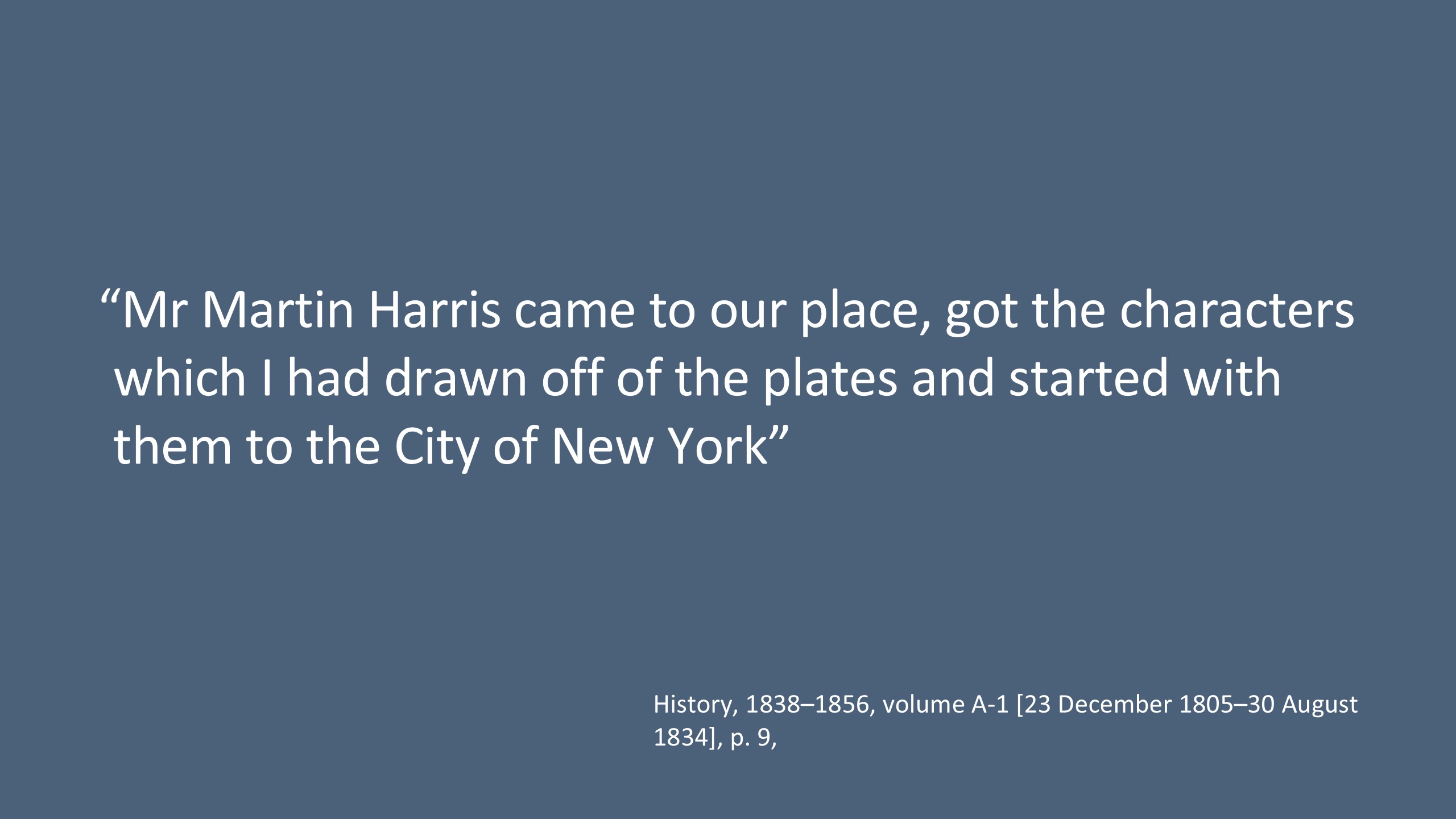 Martin Harris, as interviewed by William Pilkington (1934) William Pilkington, Affidavit, April 3, 1934, Church History Library, available on Church History Library, https://dcms.lds.org/delivery/DeliveryManagerServlet?dps_pid=IE5005099; cited in Vogel, Early Mormon Documents, 2:353–56.