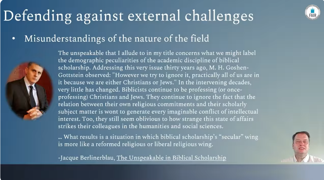 Of course when Berlinerblau mentions the problem of conflicts of intellectual interest, this is not a problem when, for example, a scholar is counting usages of a particular phrase in the Septuagint book of Genesis. Those usages are simply data. But when a scholar decides that those data are evidence of a narrative about those data, we exit the realm of objectivity. A scholar’s background, worldview, and any number of other personal factors will steer the scholar’s adoption of that narrative over a different narrative held by other scholars who have similar training.