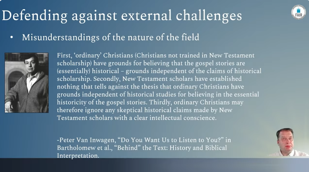 First, ordinary Christians, Christians not trained in New Testament scholarship, have grounds for believing that the gospel stories are essentially historical–grounds independent of the claims of historical scholarship. Secondly, New Testament scholars have established nothing that tells against the thesis that ordinary Christians have grounds independent of historical studies for believing in the essential historicity of the gospel stories. Thirdly, ordinary Christians may therefore ignore any skeptical historical claims made by New Testament scholars with a clear intellectual conscience.