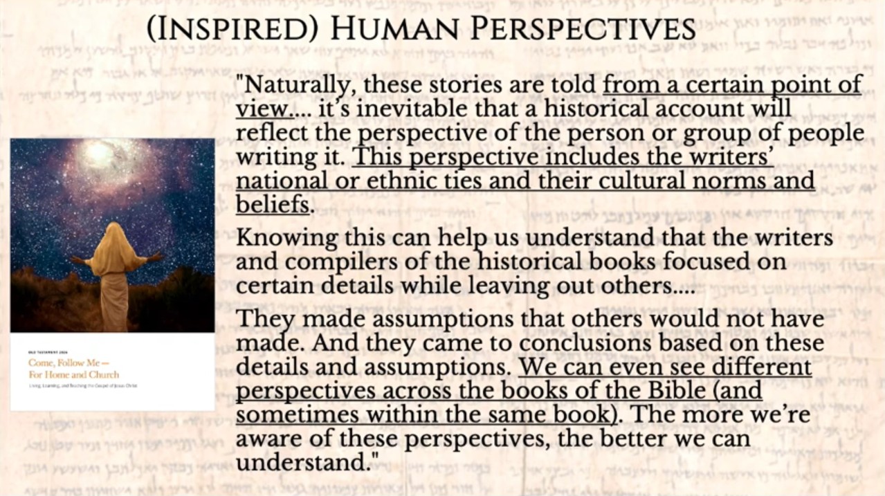 Here is Come, Follow Me for 2026: Naturally, these Old Testament stories are told from a certain point of view. It’s inevitable that a historical account will reflect the perspective of the person or groups of people writing it. This perspective includes the writer’s national or ethnic ties and their cultural norms and beliefs. Knowing this can help us understand that the writers and compilers of the historical books focused on certain details while leaving out others. They made assumptions that others would not have made, and they came to conclusions based on these details and assumptions.
