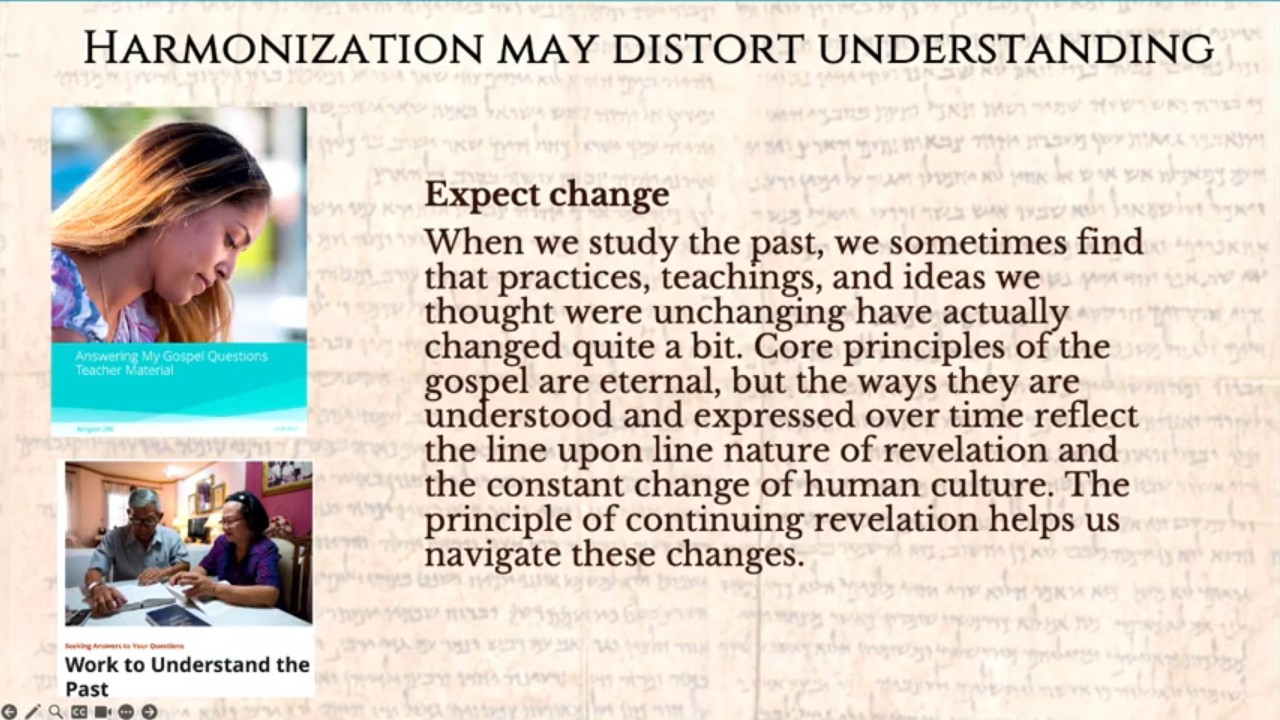 Now, I have actually spoken about accommodation at a prior FAIR conference, and you can go back and watch that — and there are lots of references. And this brings me to assumption number four that we find in current church teaching and from modern revelation, which is: harmonization may in fact distort understanding.