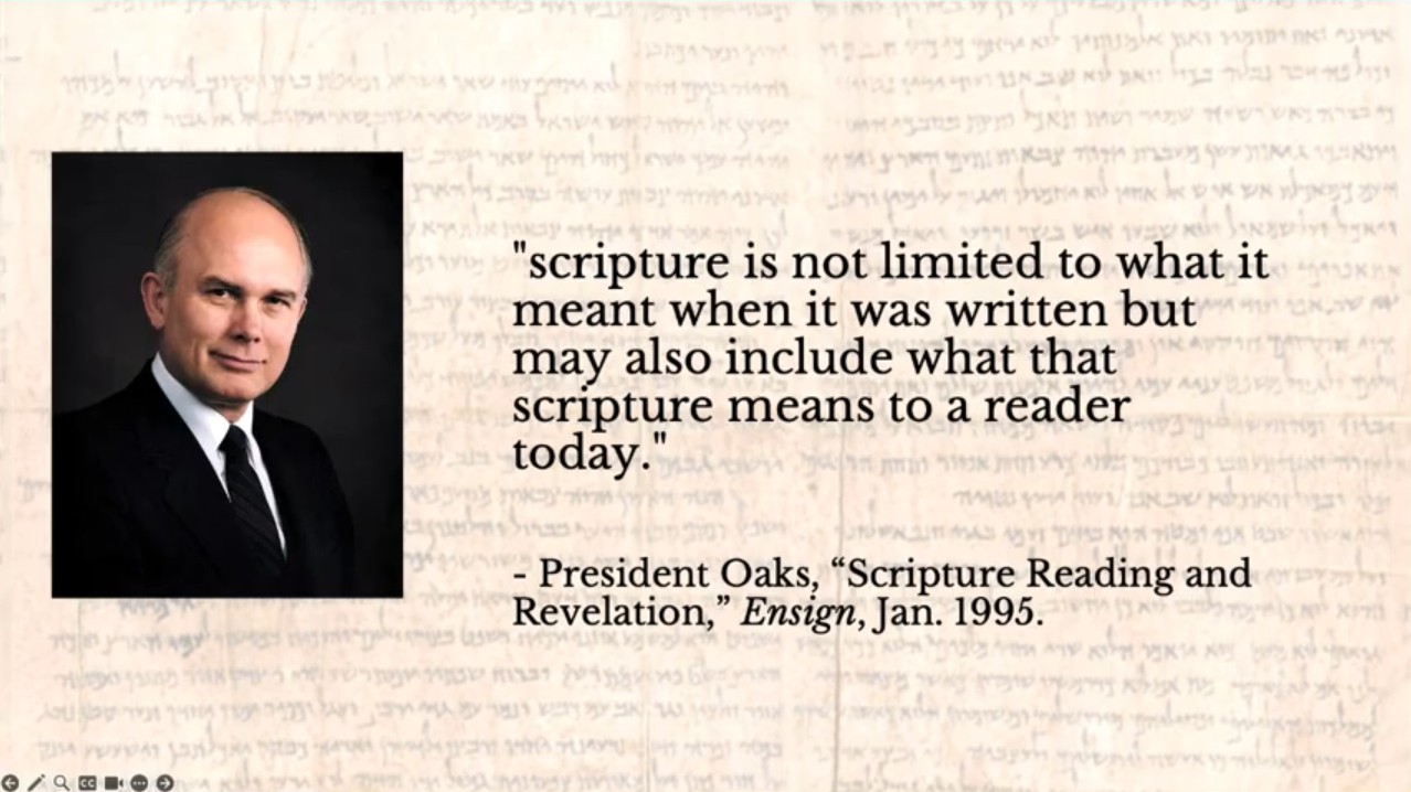 Now, I should also clarify that when I am talking about the meaning of scripture, I am primarily talking about the meaning as the authors intended anciently. I want to acknowledge that there is another meaning that’s important. President Oaks taught that scripture is not limited to what it meant when it was written, which is what concerns us today, but may also include what that scripture means to a reader today. The second is more of a devotional or spiritual aspect of reading scripture. And we need to be doing both.