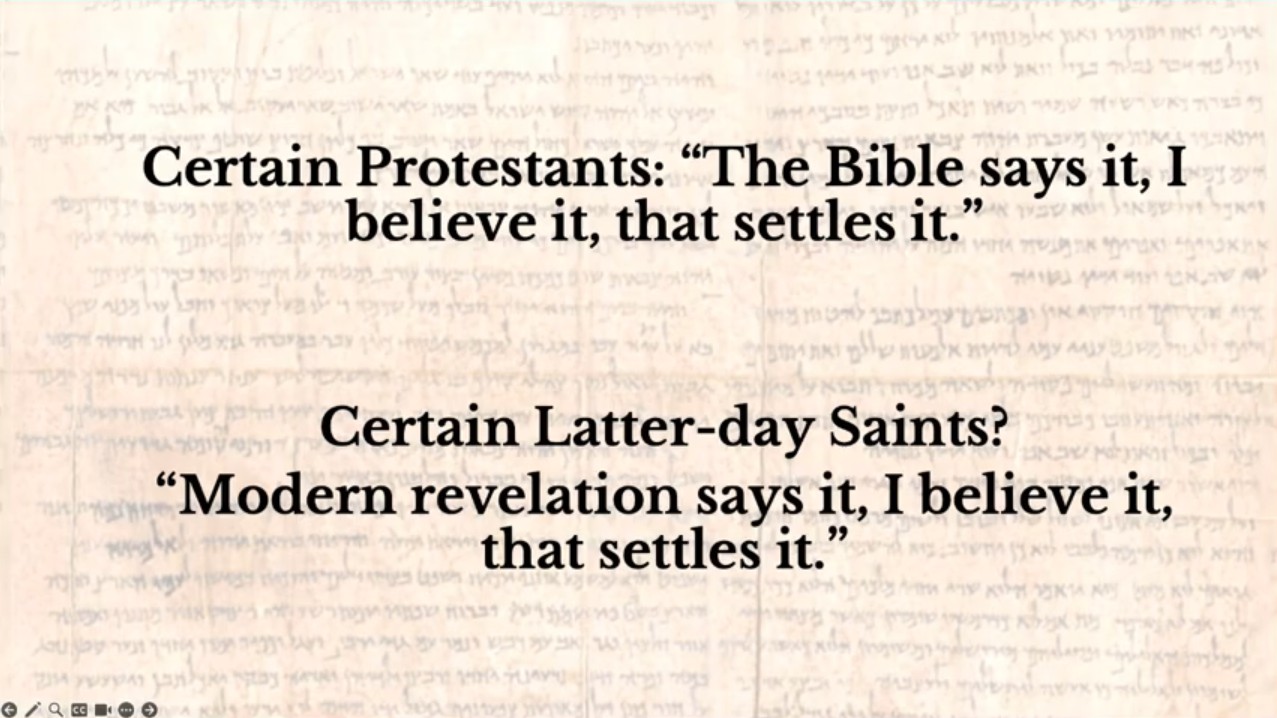But on the other hand, we have certain Latter-day Saints who may think that, Well, of course the Bible hasn’t been translated correctly, but modern revelation says it, I believe it, that settles it. That is still treating scripture like the divine encyclopedia model.