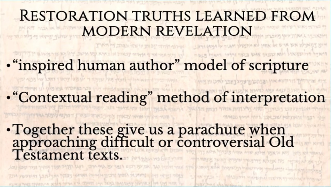 This is wonderfully liberating from the straight jacket, as we will see — and these come from studying modern revelation closely together. These give us a parachute when approaching difficult or controversial Old Testament texts instead of the straight jacket.