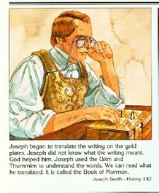 Smith used scribes to write the words he said were a translation of the golden plates, dictating these words while peering into seer stones, which he said allowed him to see the translation. Smith's translation ability evolved naturally out of his earlier treasure seeking,[2] and he used a process that was "strikingly similar" to the way Smith used seer stones for treasure hunting.[3] For the earliest phase of translation, Smith said that he translated using what he called the "Urim and Thummim"—a set of large spectacles with stones where the eye-pieces should be.[4] There is no eye-witness testimony that Smith ever wore the large spectacles, although some witnesses understood that he placed them in his hat while translating.[5] Witnesses did observe Smith using a single seer stone (not part of a set of spectacles) in the translation,[6] the same brown stone Smith had earlier used for treasure seeking.[7]