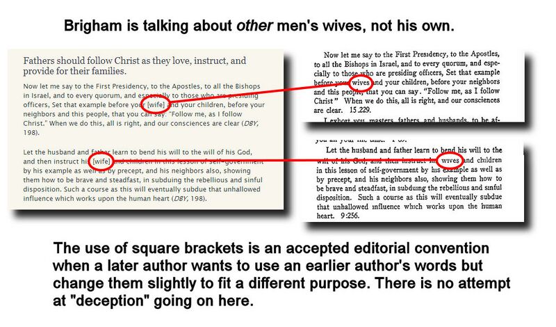 Além disso, o uso de colchetes é uma convenção editorial aceita quando um autor, anos mais tarde, quer usar as palavras de um autor de anos atrás, mas alterá-los um pouco para atender a uma finalidade diferente, sem alterar a mensagem geral da citação. No caso da citação em questão, Brigham Young está dando conselhos a um grupo de homens sobre como eles podem ser bons líderes em suas famílias, o que para muitos deles na época teria incluído casamentos polígamos. Na igreja moderna, os membros teriam apenas um cônjuge, mas o conselho sobre como ser bons líderes das famílias ainda é relevante, embora isso exigiria uma mudança editorial (claramente marcado entre colchetes) para alterar "esposas" por "esposa".