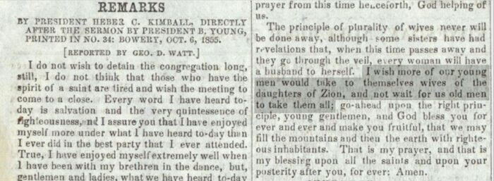 Yet, when they were home, Kimball encouraged younger men to enter plural marriage, and joked that he was tired of not having their support in this endeavor. The critics' reading, then, is questionable.