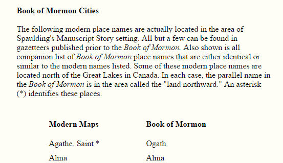 No entanto, o próprio Holley afirma ter usado mapas modernos e nomes de lugares modernos em sua comparação. Holley afirma que "Os seguintes nomes de lugares modernos são, na verdade, localizado na área de História do Manuscrito Spaulding ajuste. Todos, mas alguns podem ser encontrados em dicionários publicados antes de o Livro de Mórmon". [2] Não Holley não listar os dicionários que ele usou. Holley indica que ele está comparando "Mapas modernos" contra o "Livro de Mórmon".
