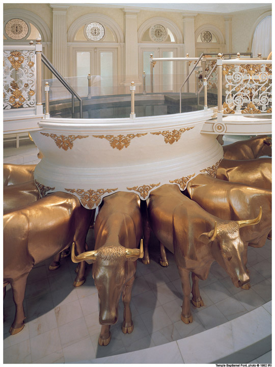 Temple baptismal fonts are patterned after the “molten sea” which was present in Solomon’s temple, a basin for ritual washing that rested on the backs of twelve oxen, representing the twelve tribes of Israel (see 1 Kings 7:23-26).