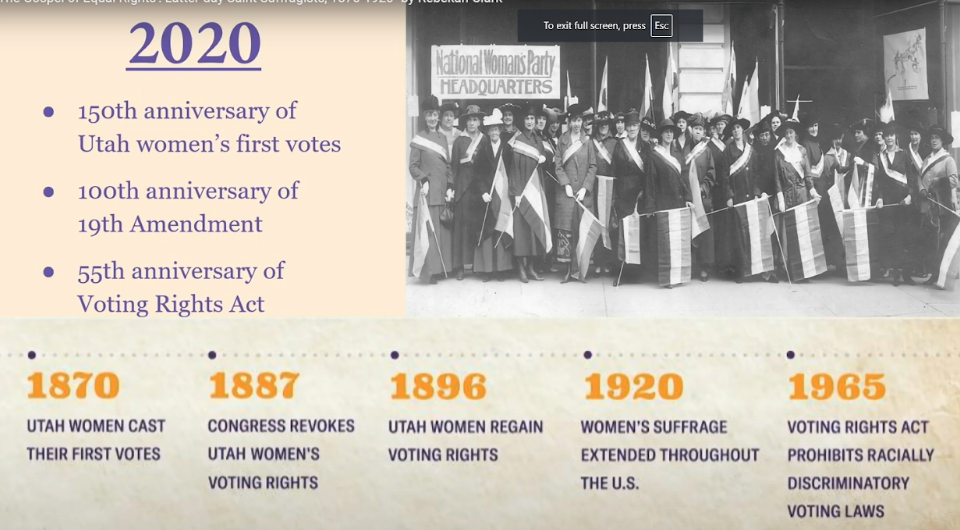 Significantly, these suffrage anniversaries also converged with the 200th anniversary of the restoration of the Church through Joseph Smith. This is actually very appropriate because Latter-day Saint suffragists, in fact, saw their advocacy for women’s voting rights as part of the restoration of the gospel. I think that’s really important.